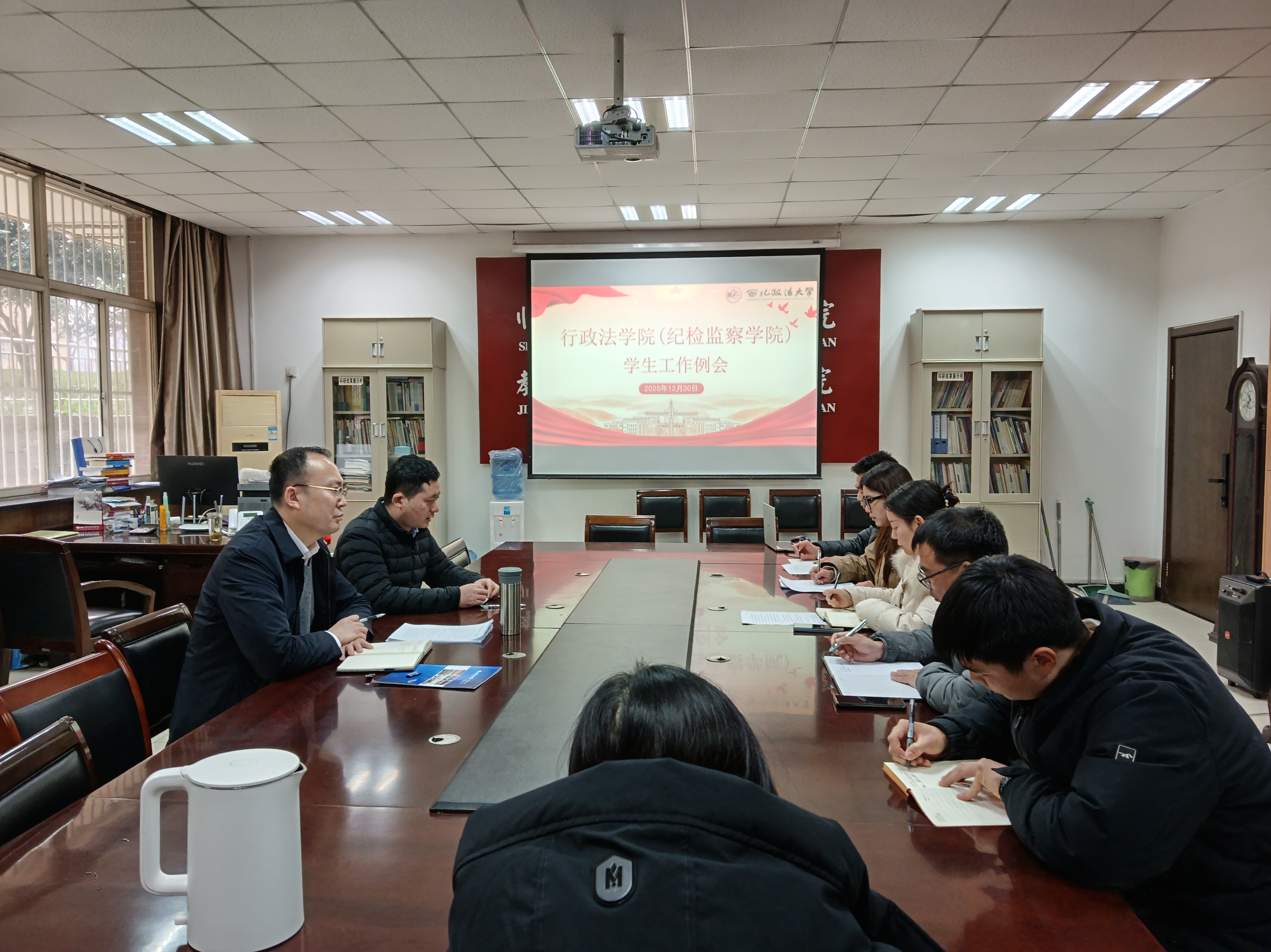 为落实立德树人根本任务,精准把握学生工作核心重点,科学谋划下一阶段工作路径,12月30日下午,行政法学院(纪检监察学院)召开学生工作专题会议。院党委书记高翔、副书记樊丁及全体辅导员参加会议。 会上,全体参会人员结合工作实际,围绕学风建设、思想引领、日常管理、就业服务、心理健康教育等核心职责,全面梳理了本学期工作开展情况,客观剖析了当前工作中存在的难点堵点问题,并结合学生群体特征与学院专业特色,提出针对性强、可操作性高的下一步工作思路及具体举措,为学院统筹推进学生工作提供了详实参考。 高翔在总结讲话中强调,学生工作关乎人才培养质量和学院长远发展。他充分肯定了全体辅导员的辛勤付出与工作成效,并提出三点要求:一是强化思想引领,引导学生坚定理想信念、树立正确世界观、人生观、价值观;二是提升专业素养,推动学生工作向专业化、精细化迈进,切实增强育人温度与实效;三是守牢安全底线,从严从实筑牢校园稳定屏障。 会前,樊丁传达了学校近期学生工作相关会议精神,重点解读了学校关于加强学生思想政治教育、筑牢校园安全防线、提升学工队伍专业化水平等方面的工作要求,并对下一阶段重点任务作出具体安排部署。 此次专题会议的召开,进一步明确了学院下一阶段学生工作的目标任务与工作重点,有效凝聚了育人合力。全体辅导员纷纷表示,将切实把会议精神落到实处,以更饱满的热情、更务实的作风投身学生工作,为培养德法兼修、全面发展的高素质法治人才作出应有贡献。