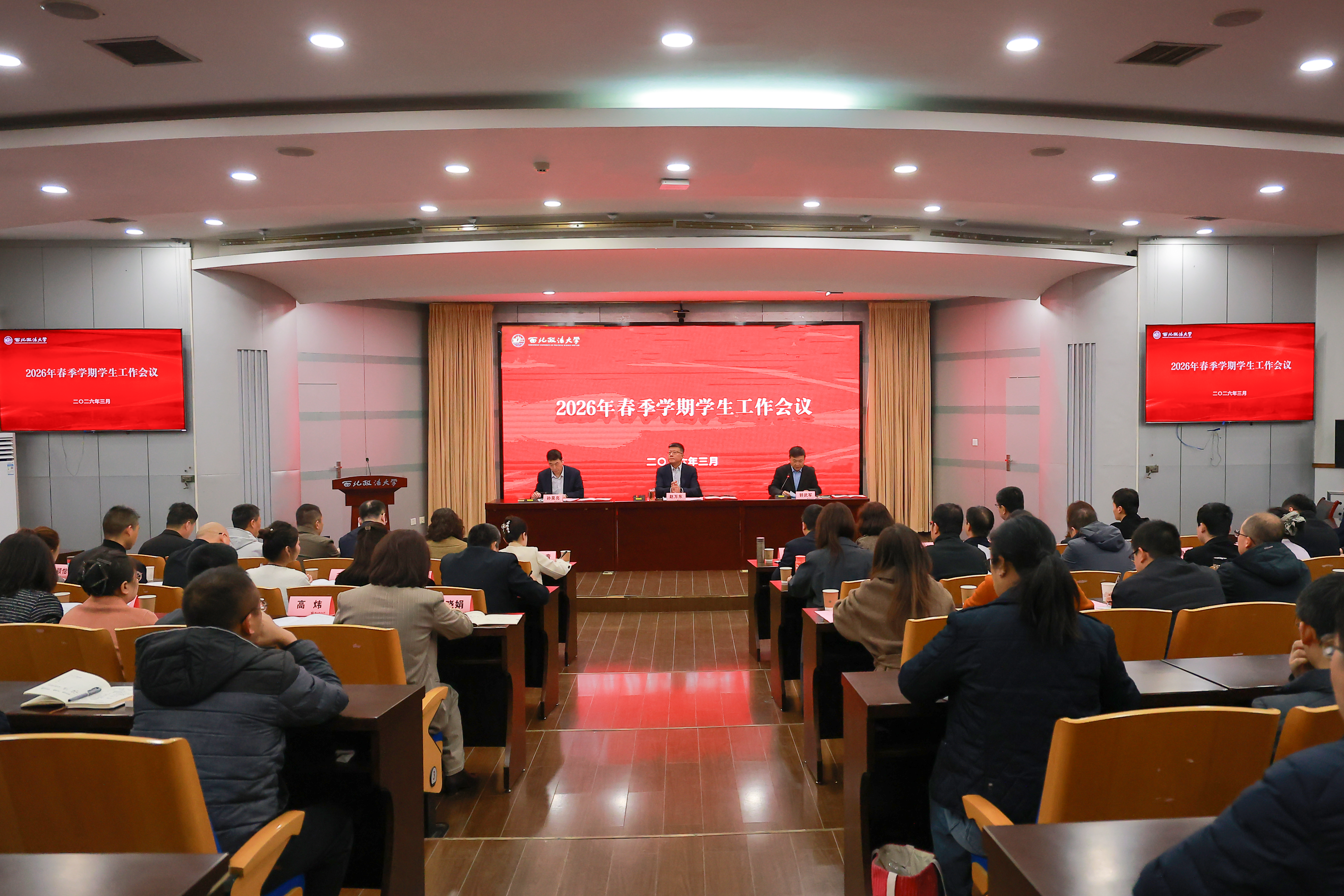 3月19日上午,我校在长安校区校务楼二楼报告厅召开2026年春季学期学生工作会议。校党委书记赵万东、副校长孙昊亮出席会议,相关部门负责同志和各学院党委书记、分管学生工作副书记,全体专兼职辅导员参加会议。校党委副书记郭武军主持会议。 党委学工部、招生就业处、校团委负责人分别安排部署本部...