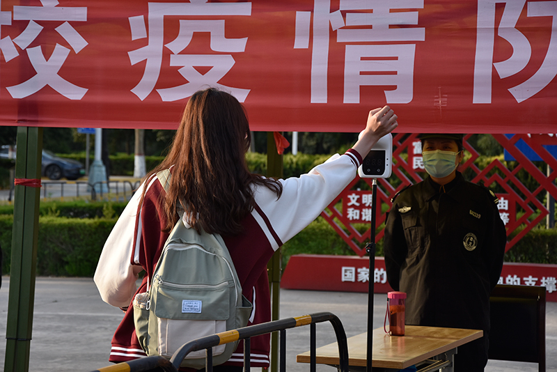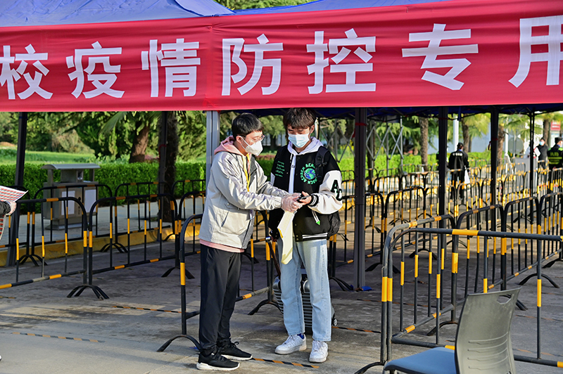 按照返校流程,学生出示本人电子版返校凭证,接受体温检测,查验健康码、行程码和48小时核酸检测阴性报告后进入校园。为保障校内师生身体健康和生命安全,学校为全体在校学生制作了专门贴纸,作为请假外出后返回学校的凭证,进一步提升外防输入精准防控水平。