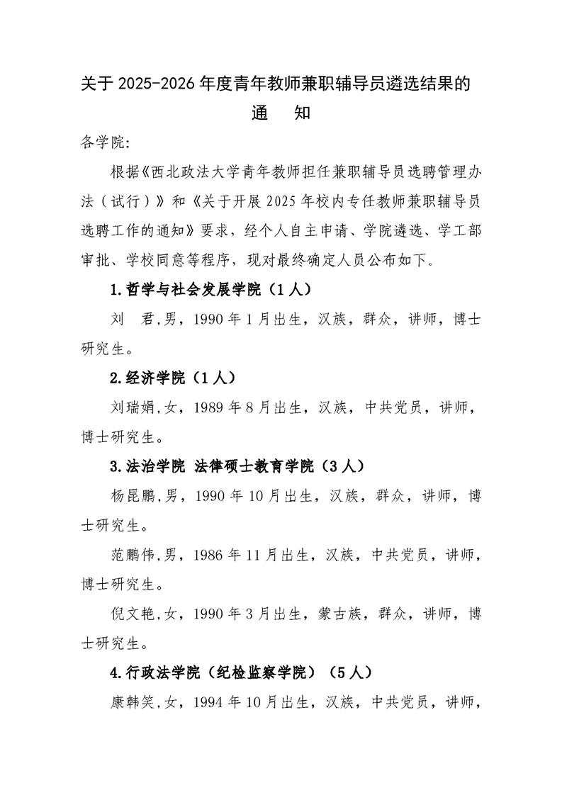 关于2025-2026年度青年教师兼职辅导员遴选结果的通知