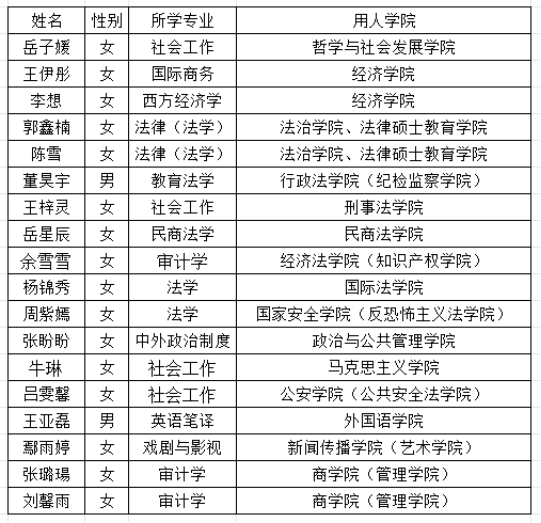根据《西北政法大学学生担任兼职辅导员工作实施办法》(西法大校发〔2026〕20号)和《关于开展西北政法大学学生担任兼职辅导员选聘工作的通知》文件要求,经个人报名、学院审核、资格复查、岗位适应性考察等环节,现将学校2026年学生担任兼职辅导员拟聘用学生结果予以公示。